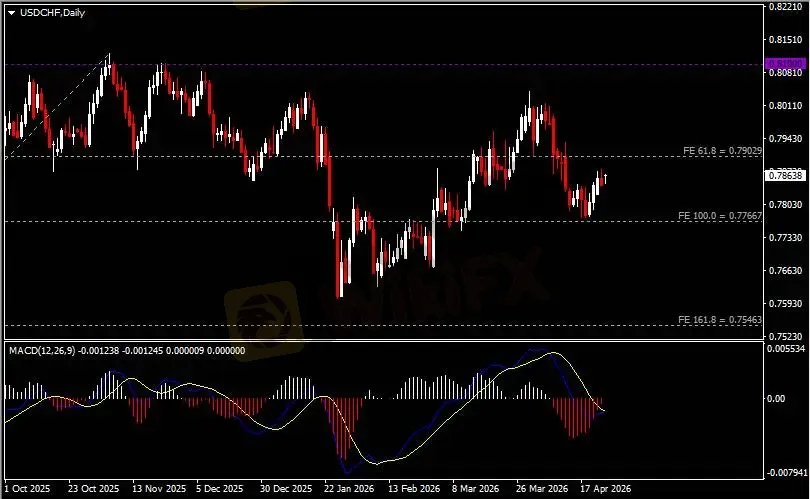 日线图显示美元兑瑞郎反弹暂缓,当前仍收于0.7770支撑。从MACD来看,快慢线欲形成金叉,红色动能柱温和收缩。汇价走势和动能柱的变化呈分歧。