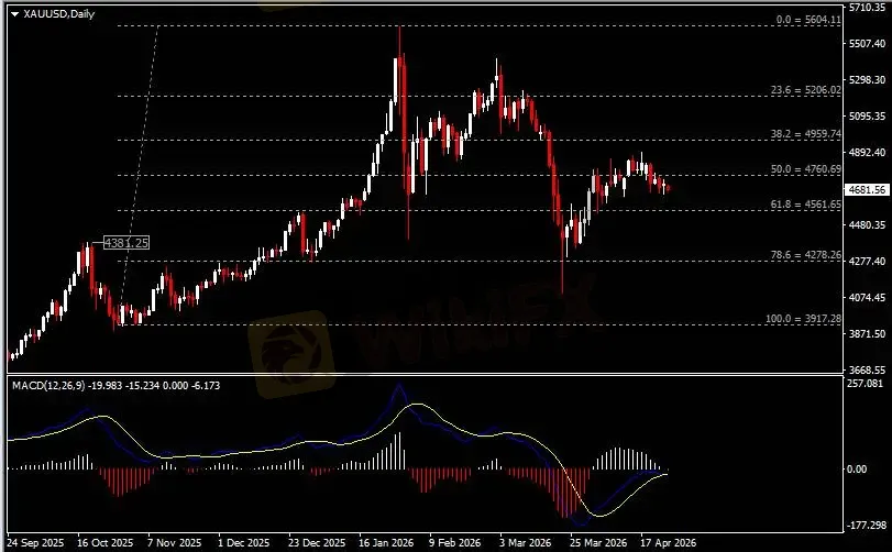 日线图显示金价回调暂缓,当前承压于4760阻力。从MACD来看,快慢线形成死叉,白色动能柱收缩殆尽。金价走势和动能柱的变化呈分歧。