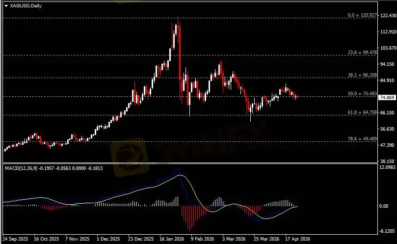 日线图显示银价持稳于75.50支撑。从MACD来看,快慢线形成死叉,白色动能柱收缩殆尽。银价走势和动能柱的变化稍有分歧。