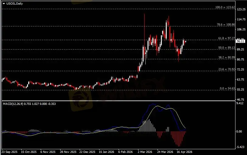 日线图显示油价小幅回落,当前承压于97.30阻力。从MACD来看,快慢线逐渐收窄,红色动能柱温和收缩。油价走势和动能柱的变化呈分歧。