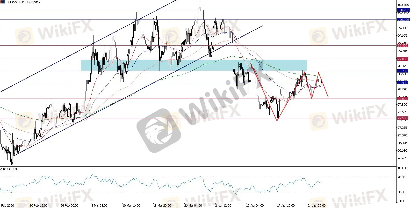 技术面上,98.70 至 99.00 区域依然是主要的阻力区。随着近期走势进入盘整,98.40 水平充当着近期的即时支撑。如果我们看到抛售压力持续跌破 98.40,该指数很可能会经历进一步的下行走势。
