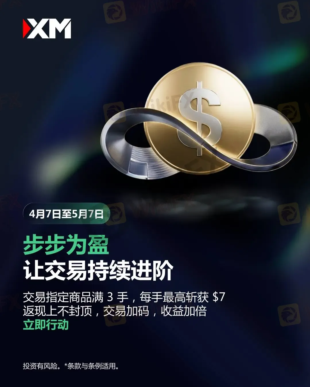 摘要:XM再次加码福利,带来全新升级的返现福利!📅 活动时间:2026/4/7 – 5/7完成认证的XM用户交易达标,即可解锁每手最高$7返现,重点是——奖励无上限,支持出金!本次活动不仅返现力度更大,参与门槛依然友好:指定商品交易满 3 手,即可开启返现部分商品支持 7 天交易边交易边拿奖励,让每一笔操作更有价值交易越多,返现越多,上不封顶。立即注册,开启你的无限返现之旅!