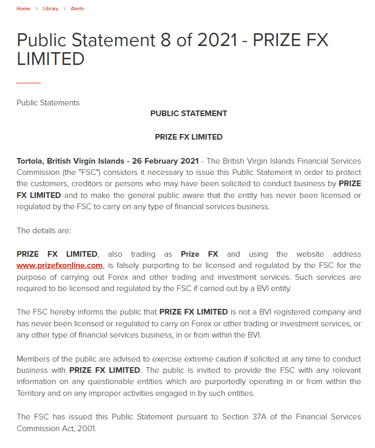 2021 年第 8 号公开声明 - Prize FX有限的公开声明 公开声明 Prize FX英属维尔京群岛托托拉岛 - 2021 年 2 月 26 日 - 英属维尔京群岛金融服务委员会(“fsc”)认为有必要发布此公开声明,以保护客户、债权人或可能被招揽开展业务的人员经过 Prize FX有限,并让公众知道该实体从未获得 fsc 的许可或监管,无法开展任何类型的金融服务业务。详情如下: Prize FX有限公司,也交易为 Prize FX并使用网站地址 www.prizefxonline.com,虚假地声称获得了 fsc 的许可和监管,以便开展外汇和其他交易和投资服务。此类服务如果由英属维尔京群岛实体开展,则需要获得 fsc 的许可和监管。 fsc特此通知公众 Prize FXlimited 不是英属维尔京群岛注册公司,也从未获得在英属维尔京群岛境内或从英属维尔京群岛境内从事外汇或其他交易或投资服务或任何其他类型的金融服务业务的许可或监管。如果在任何时候被要求与以下公司开展业务,建议公众格外小心 Prize FX有限的。请公众向金融服务委员会提供有关据称在领土内或从领土内经营的任何可疑实体以及此类实体从事的任何不当活动的任何相关信息。 FSC 根据 2001 年金融服务委员会法第 37a 条发布了这份公开声明。