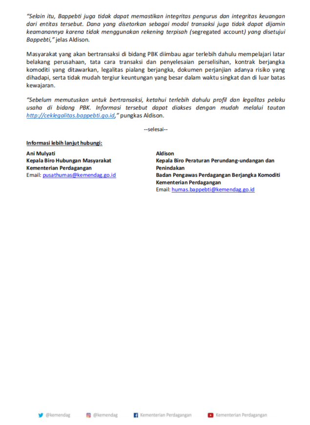 “雅加达,2022 年 9 月 20 日——贸易部通过商品期货交易监督机构 (Bappebti) 屏蔽了 760 个实体,包括 682 个网站域、48 个社交媒体页面、Google Play 上的 17 个应用程序、Appstore 上的 12 个应用程序,以及在 2022 年 1 月至 8 月期间没有获得 CoFTRA 许可的商品期货交易 (PBK) 部门的一站活动。封锁是与通信和信息部合作进行的“每一方进行期货印度尼西亚的交易活动必须获得 CoFTRA 的许可,并遵守和遵守印度尼西亚现行法律法规的规定。即使他们声称拥有海外监管机构的合法性,但在印度尼西亚期货交易领域提供报价的公司仍然需要获得 CoFTRA 的许可,”CoFTRA 代理负责人 Didid Noordiatmoko 说。Didid 补充说,Bappebti 经常对网站域和社交媒体账户进行在线观察和监督,这些网站域和社交媒体账户在 CPF 部门以及未经 CoFTRA 许可在 CPBP 部门开展业务活动的实体申请。 “这种监测和观察以及封锁是防止 CBA 活动在没有 CoFTRA 许可的情况下对社区造成潜在损失的一个步骤。除此之外,它还为 CPB 部门的社区和商业参与者提供法律确定性,”Didid 补充道。 Didid提醒,在没有CoFTRA营业执照的期货经纪商处进行交易风险很大。 CoFTRA 作为监管机构无法在客户与无牌实体发生纠纷时协助客户进行调解。法律法规和执法局局长奥尔迪森补充说,该实体在印度尼西亚也没有代表处。如客户感到委屈,任何一方概不负责。它在国外的存在也不确定是否可以确定其合法性。这需要大量资金来解决纠纷。 “此外,CoFTRA 无法确保实体的管理完整性和财务完整性。作为交易资金存入的资金的安全性无法得到保证,因为它们没有使用 CoFTRA 批准的隔离账户,”Aldison 解释道。欲从事PBK领域交易的人士,建议先了解公司背景、交易及争议解决程序、所提供的商品期货合约、期货经纪商的合法性、所面临风险的文件协议,不要轻易被诱惑在短时间内获得大量利润。并且出界。 “在决定交易之前,首先要了解 CPB 行业中商业参与者的概况和合法性。这些信息可以通过链接 http://ceklegalitas.bappebti.go.id 轻松访问,”Aldison 总结道。