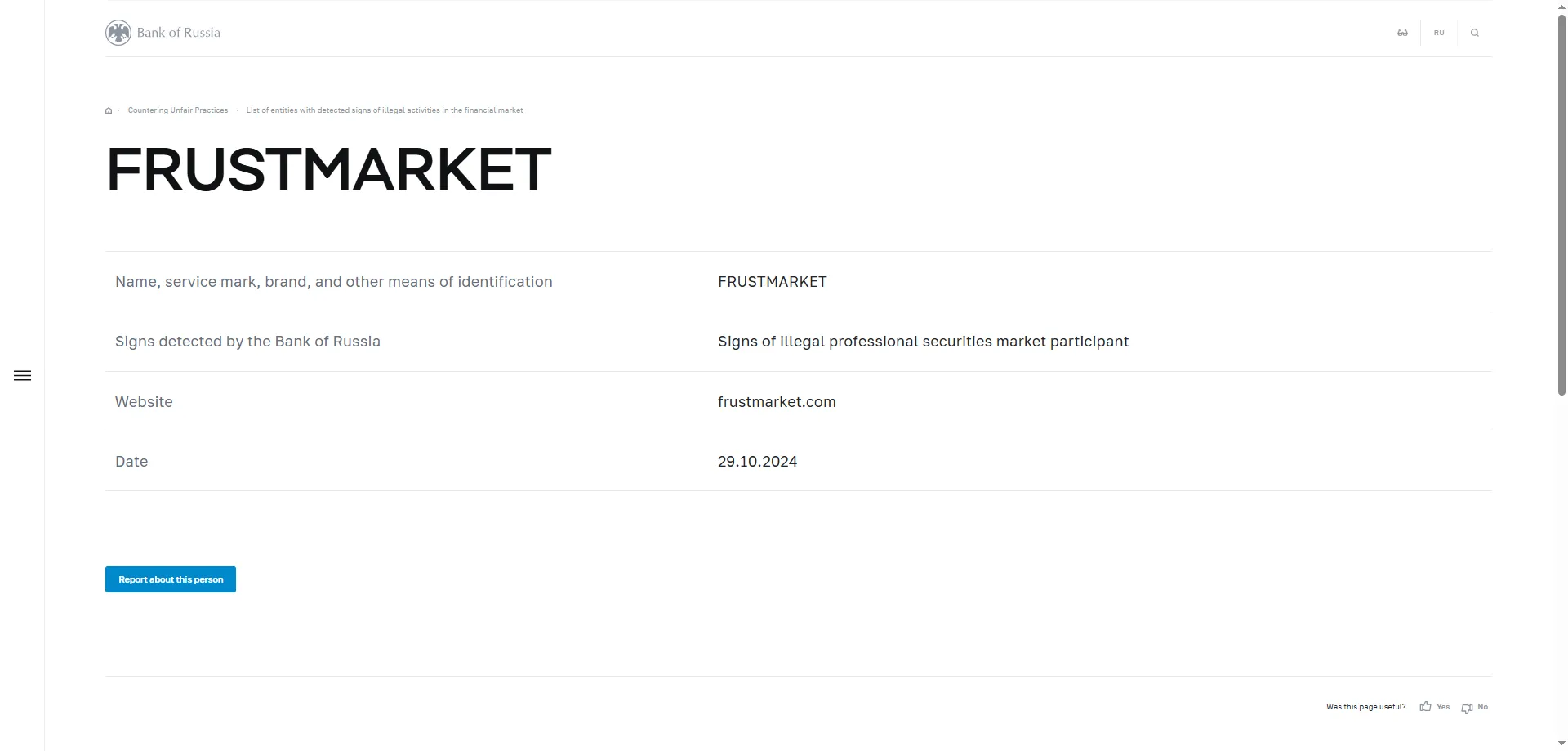 名称、服务标志、品牌及其他识别方式 FRUSTMARKET 俄罗斯银行检测到的迹象 非法证券专业市场参与者的迹象 网站 frustmarket.com 日期 2024年10月29日.