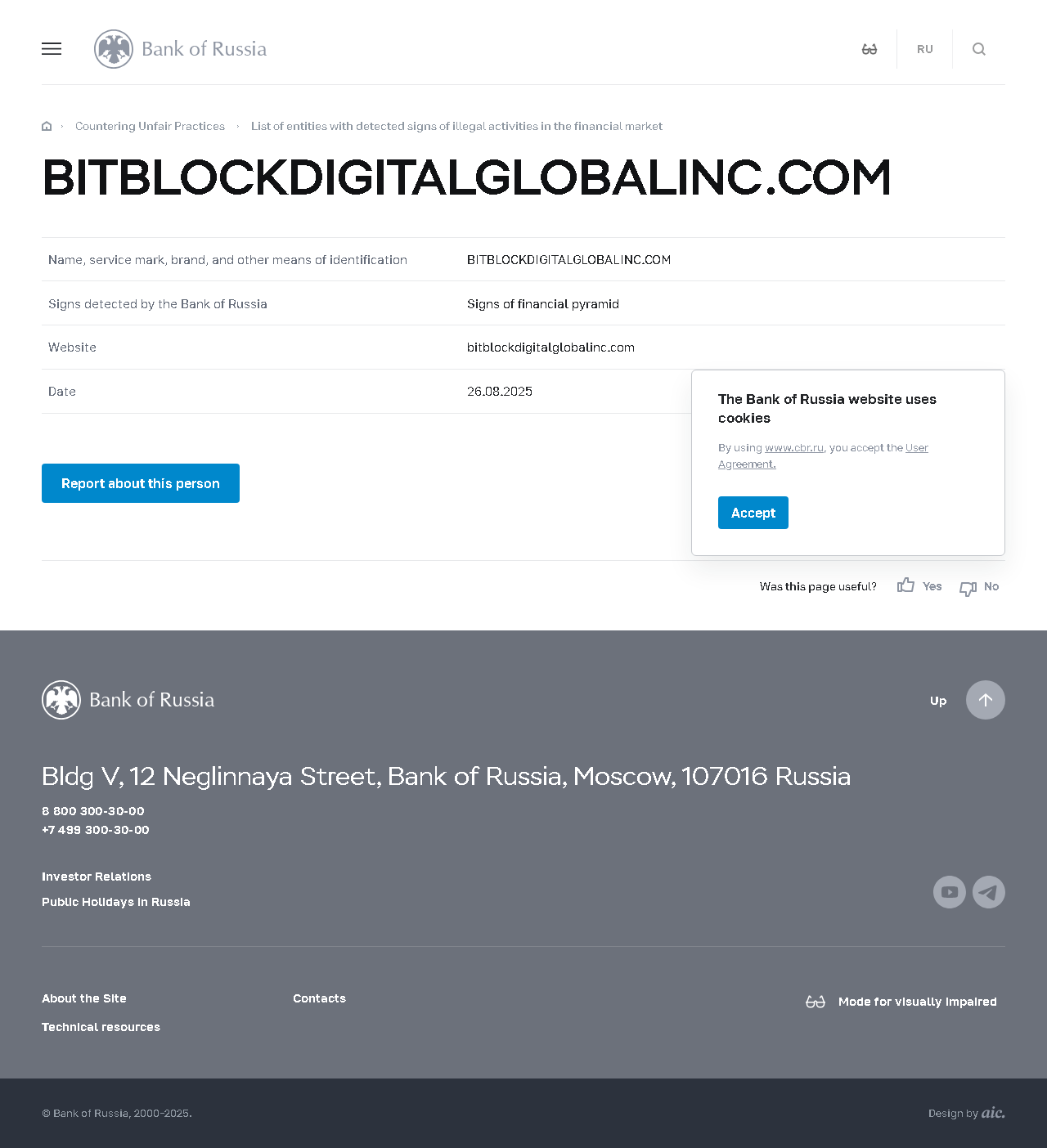 名称、服务标志、品牌及其他识别方式 BITBLOCKDIGITALGLOBALINC.COM 俄罗斯银行检测到的迹象 金融金字塔特征 网站 bitblockdigitalglobalinc.com 日期 26.08.2025.