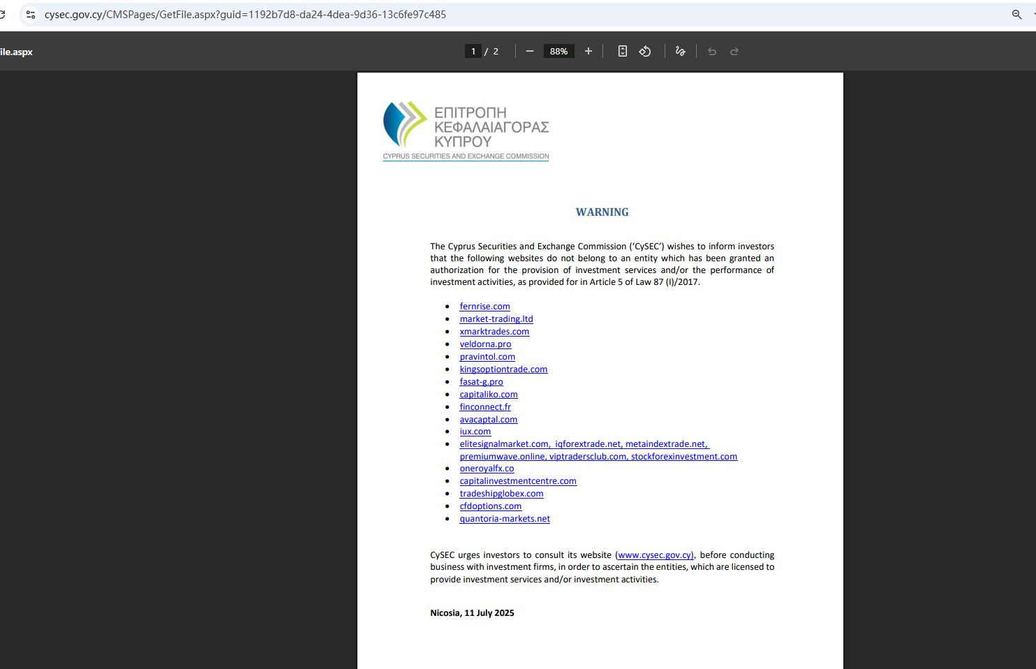 塞浦路斯证券交易委员会(‘CySEC’)特此告知投资者,以下网站不属于根据2017年第87(I)号法律第5条获得授权提供投资服务和/或从事投资活动的实体。 • fernrise.com • market-trading.ltd • xmarktrades.com • veldorna.pro • pravintol.com • kingsoptiontrade.com • fasat-g.pro • capitaliko.com • finconnect.fr • avacaptal.com • iux.com • elitesignalmarket.com, iqforextrade.net, metaindextrade.net, premiumwave.online, viptradersclub.com, stockforexinvestment.com • oneroyalfx.co • capitalinvestmentcentre.com • tradeshipglobex.com • cfdoptions.com • quantoria-markets.net CySEC敦促投资者在与投资公司开展业务前,查阅其官网(www.cysec.gov.cy),以确认哪些实体具备提供投资服务和/或投资活动的合法资质。 尼科西亚,2025年7月11日