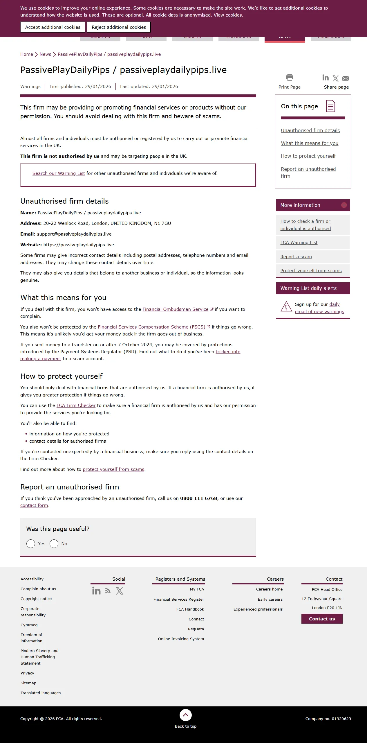 FCA未经授权公司警告名单 PassivePlayDailyPips / passiveplaydailypips.live.