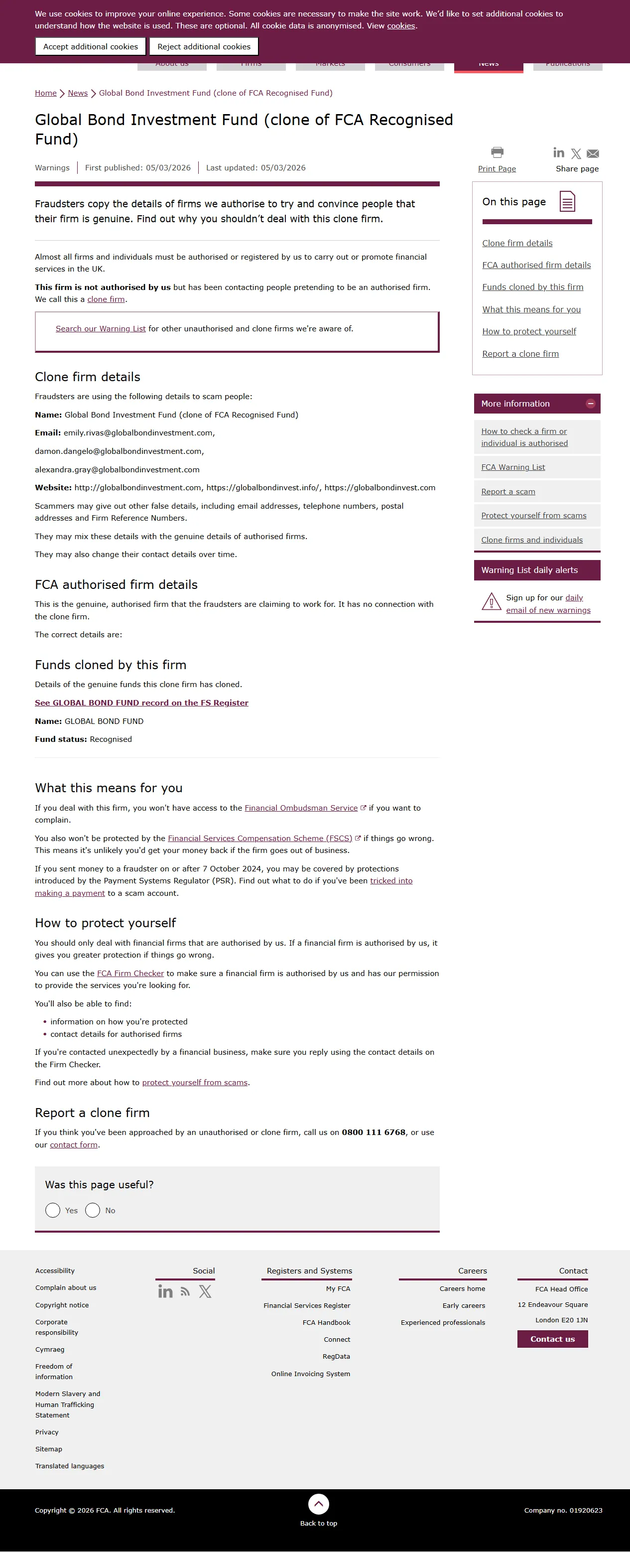 FCA未授权公司警告名单 Global Bond Investment Fund(FCA认可基金的克隆公司).