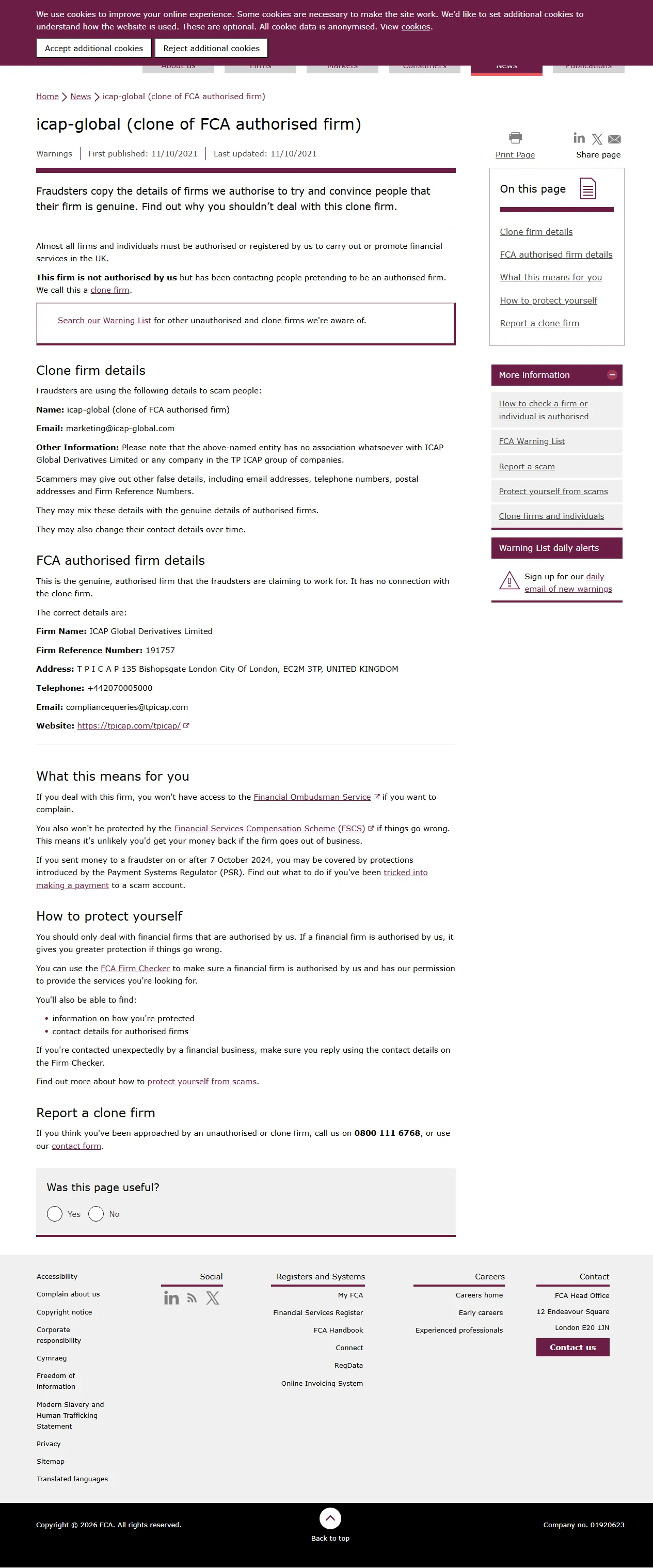 诈骗分子复制我们授权公司的详细信息,试图让人们相信他们的公司是真实的。了解为什么您不应该与这家克隆公司打交道。几乎所有公司和个人都必须获得我们的授权或注册,才能在英国开展或推广金融服务。这家公司未经我们授权,但一直冒充授权公司联系人们。我们调用这是一家克隆公司。在我们的警告列表中搜索我们已知的其他未经授权和克隆公司。克隆公司详情诈骗分子正在使用以下详细信息诈骗人们:名称:icap-global(FCA授权公司的克隆)电子邮件:marketing@icap-global.com其他信息:请注意,上述实体与ICAP Global Derivatives Limited或TP ICAP集团公司中的任何公司均无任何关联。诈骗者可能会提供其他虚假信息,包括电子邮件地址、电话号码、邮政地址和公司参考编号。他们可能会将这些信息与授权公司的真实信息混合使用。他们也可能随着时间的推移更改其联系信息。FCA授权公司详情这是诈骗分子声称为之工作的真实、授权公司。它与克隆公司没有任何联系。正确的详细信息是:公司名称:ICAP Global Derivatives Limited公司参考编号:191757地址:T P I C A P 135 Bishopsgate London City Of London, EC2M 3TP, UNITED KINGDOM电话:+442070005000电子邮件:compliancequeries@tpicap.com网站:https://tpicap.com/tpicap/.