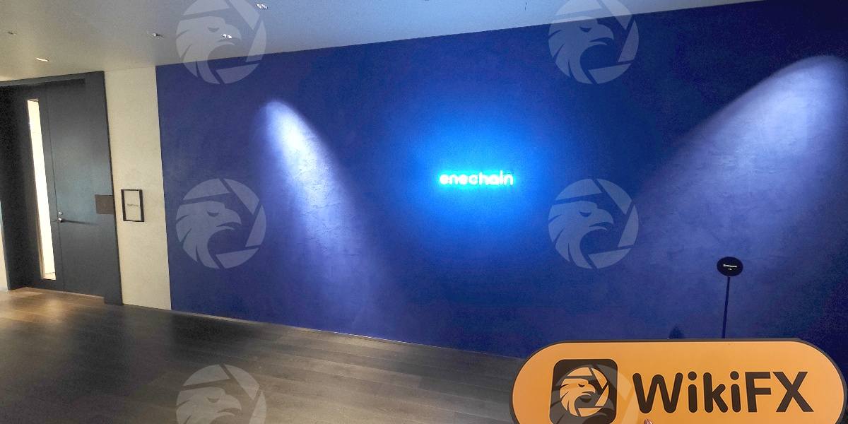抵达目标楼层后,实勘人员一出电梯就看到了 enechain 的前台,前台区域整洁醒目,并且能清晰拍到前台以及上面的公司 LOGO。整个楼层一层都是 enechain 的办公区域,实勘人员获得许可进入了公司内部,观察到公司内部办公环境良好,装修整洁,整体氛围符合其作为外汇交易商的专业定位。