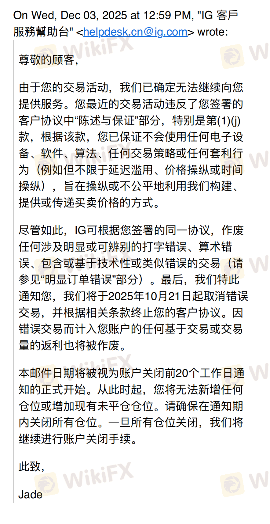 我在 IG VIP 平台申請提款,儘管我是 VIP,但仍然沒有收到。投訴後,他們給我發了一封電子郵件,解釋說他們將處理提款,並且他們的平台有問題,他們要求我等待,因為他們會向所有客戶發送無法提款的通知。我正在等待您的 IG VIP 幫助,以便我可以提取資金。