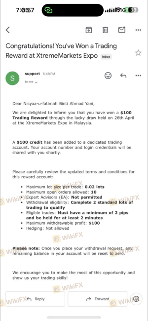 I joined the Lucky Draw promotion from this broker. Based on the official email I received, the only requirement stated was: “Complete 2 standard lots of trading to qualify.” After I completed the 2 lots, my withdrawal request was rejected with the reason that the account had a “30-day validity period” — a condition that was never mentioned in the official email or promotion details. Without any notice, my trading account was suddenly closed and cancelled, together with all the profits I had earned. When I contacted support, they replied that maybe I “did not receive the email” containing the 30-day information. This clearly shows a lack of transparency and professionalism in how the broker handles clients. As a fund manager, I believe every trader deserves clear and written terms before joining any campaign. Adding hidden conditions after trading is completed is unethical and misleading. Be careful if you are trading with Xtreme broker. If a small issue like this cannot be handl