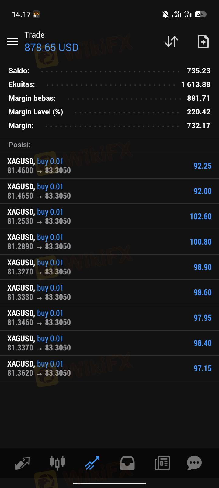 我參與該平台兩個月,利潤翻了一倍,但在 2025 年 1 月 6 日,平台自動執行了 3 筆 AUDNZD 貨幣對訂單,其交易量過高且乘數為 1.3。訂單 1: 交易量 0.05,但訂單 2: 交易量 1.83,而訂單 3 和 4 交易量 2.47... 這導致我的帳戶爆倉... 您不應該參與這個經紀商。