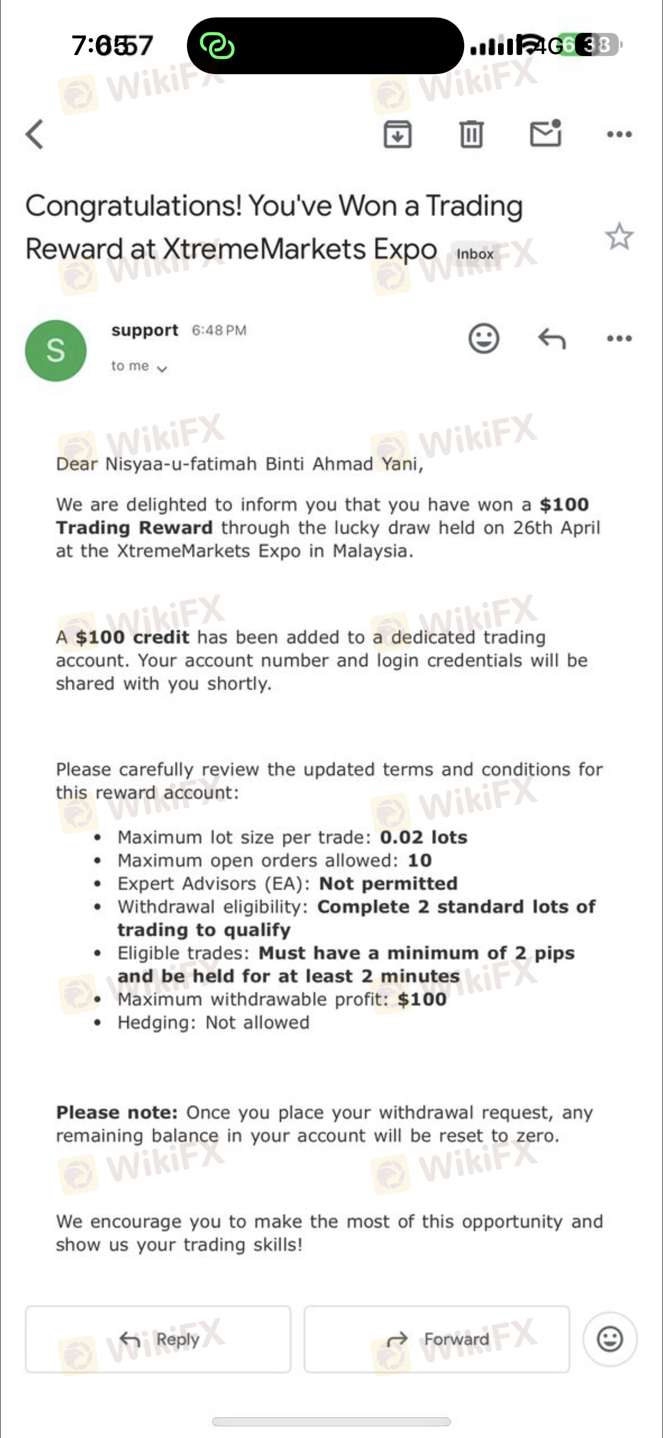 我參加了這家經紀商的抽獎促銷活動。根據收到的官方郵件,唯一的要求是: 「完成2標準手的交易即可符合資格。」 當我完成2手交易後,我的出金請求卻被拒絕,理由是帳戶有「30天有效期」——這個條件在官方郵件或促銷詳情中從未提及。 在沒有任何通知的情況下,我的交易帳戶突然被關閉並註銷,連同我賺取的所有利潤一併消失。 當我聯繫客服時,他們回覆說可能我「沒收到」包含30天條款的郵件。這明顯顯示該經紀商在處理客戶事務時缺乏透明度與專業度。 作為基金經理,我認為每位交易者都應獲得清晰且 在參與任何活動前,請詳細閱讀書面條款。交易完成後才添加隱藏條件是不道德且具有誤導性的。 如果您正在與Xtreme經紀商交易,請務必小心。 如果連這樣的小問題都無法處理