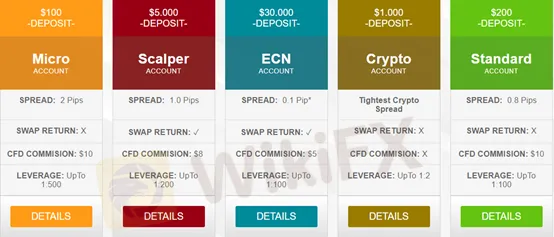 Spreads and commissions are determined by trading accounts. The Micro account features high trading costs, with spreads from 2 pips, a CFD commission of $10. The Scalper account offers spreads from 1 pip, with a CFD commission of $8. It appears that ECN account holders can enjoy lowest trading costs, with spreads as low as 0.1 pips, the CFD commission of $5. The Crypto account does not specify spreads, only hyping that investors can get tightest crypto spreads. While for the Standard account, the spreads are from 0.8 pips, with the CFD commission of $10.