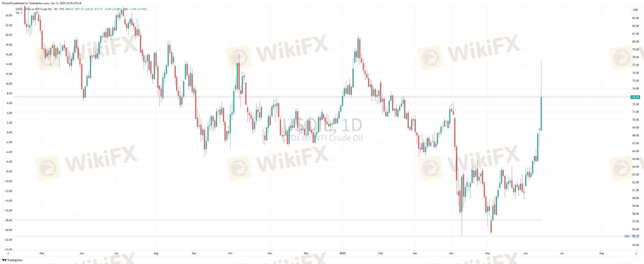这个数据是最好的体现出中东地缘冲突走向的数据之一,今天美油最高快到 78 美元了,现在还将近 73