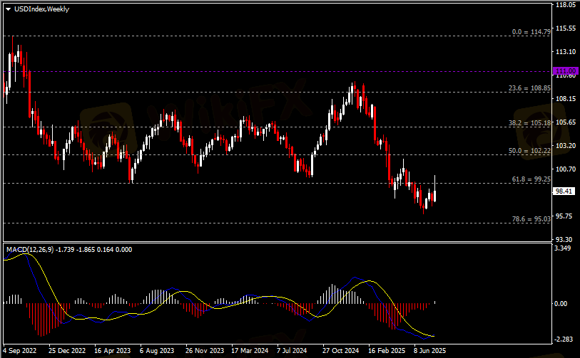 周线图显示美元指数反弹上涨,当前测试99.20阻力。从MACD来看,快慢线形成金叉,红色动能柱收缩殆尽。指数走势基本和动能柱的变化一致。
