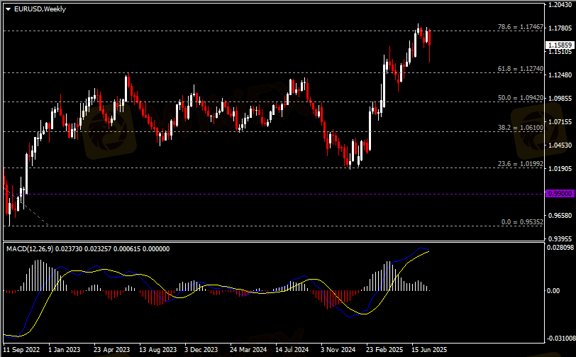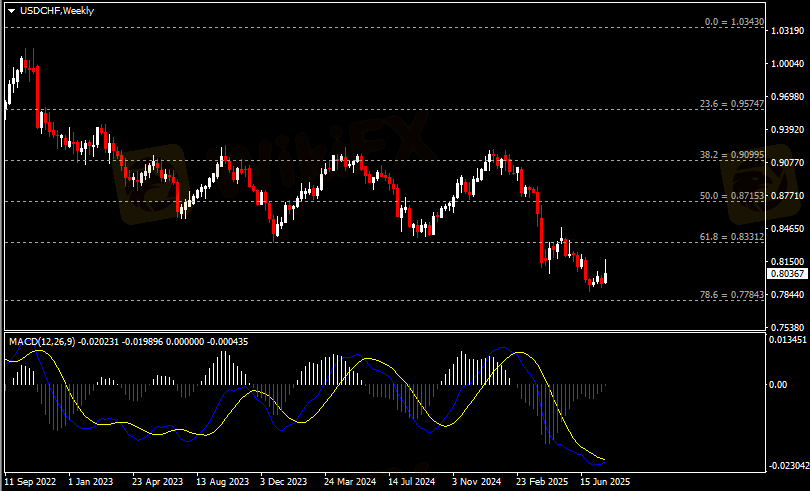 周线图显示欧元兑美元遭遇空头抛售,当前承压于1.1750阻力。 从MACD来看,快慢线逐渐收窄,白色动能柱温和收缩。汇价走势基本和动能柱的变化一致。
