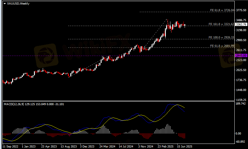 周线图显示金价于高位区间震荡,当前仍收于3320支撑。从MACD来看,快慢线向下运行,红色动能柱温和放量。金价走势和动能柱的变化呈分歧。