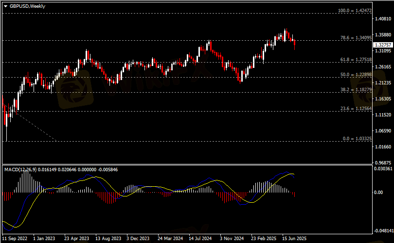周线图显示英镑兑美元高位回调,当前收于前低1.3410。 从MACD来看,快慢线拐向下行,红色动能柱温和增量。汇价走势基本和动能柱的变化一致。