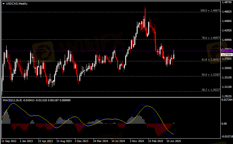 周线图显示美元兑加元反弹走强,当前测试1.3860阻力。从MACD来看,快慢线形成金叉,红色动能柱收缩殆尽。汇价走势基本和动能柱的变化一致。