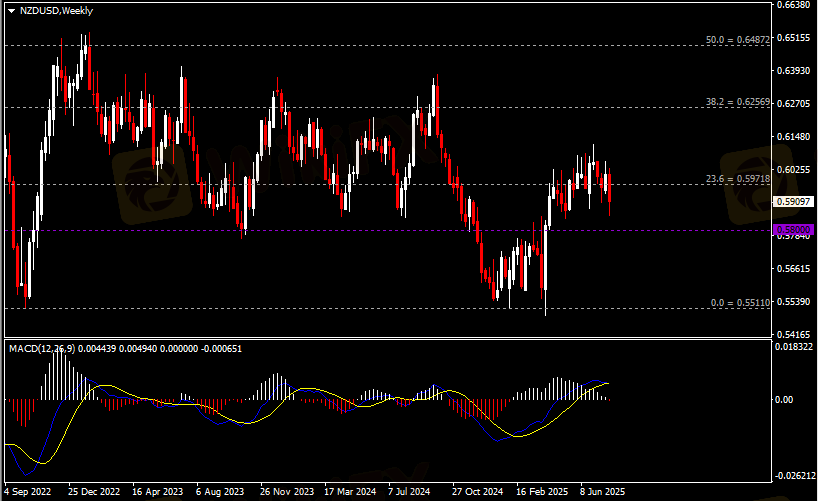 周线图显示纽元兑美元回调下跌,当前承压于前低0.5970。从MACD来看,快慢线形成死叉,白色动能柱收缩殆尽。汇价走势基本和动能柱的变化一致。