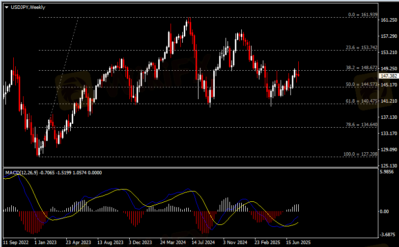 周线图显示美元兑日元先涨后跌,当前承压于148.70阻力。从MACD来看,快慢线向上运行,白色动能柱温和放量。汇价走势和动能柱的变化呈分歧。