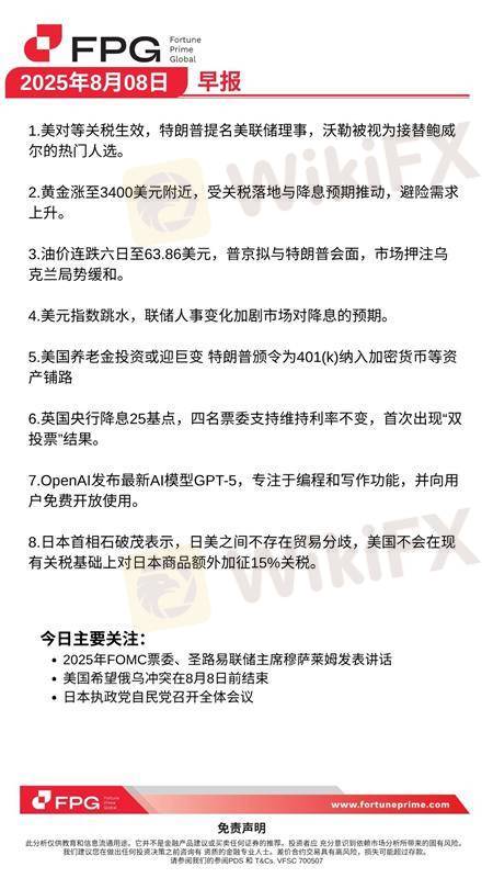 1️⃣ 美方新一轮对等关税正式生效,同时重要央行人事调整提上日程,沃勒成为潜在接任者备受关注。2️⃣ 黄金价格持续走高,触及 3400美元附近,因市场对全球政策宽松的预期升温,避险买盘增强。3️⃣ 国际油价连续第六个交易日回落,至 63.86美元/桶,地缘局势有缓和迹象,市场风险情绪改善。4️⃣ 美元指数显著下挫,投资者押注未来货币政策将更为宽松,联储领导层变化成为市场焦点。5️⃣ 美国或将调整养老金投资结构,新的行政指引或为退休账户纳入更多资产类别提供可能性。6️⃣ 英国央行宣布降息25个基点,货币政策委员会出现“意见分歧”,呈现“双向投票”局面,为近年来首次。7️⃣ OpenAI 推出新一代人工智能模型 GPT-5,聚焦编程与写作功能,现已向用户开放体验。8️⃣ 日本政府重申与美方在经贸方面沟通顺畅,近期无新增贸易措施计划,稳定市场预期。🔍【今日重点关注】-美联储票委之一、圣路易联储主席穆萨莱姆将发表讲话,市场关注政策表态-多方消息称俄乌局势或将在近日迎来重要进展-日本执政党召开例行高层会议,政策方向引发关注#XAUUSD #黄金 #外汇 #交易商测評 #大神幫我看 #CommunityAMA #交易商口碑大赏