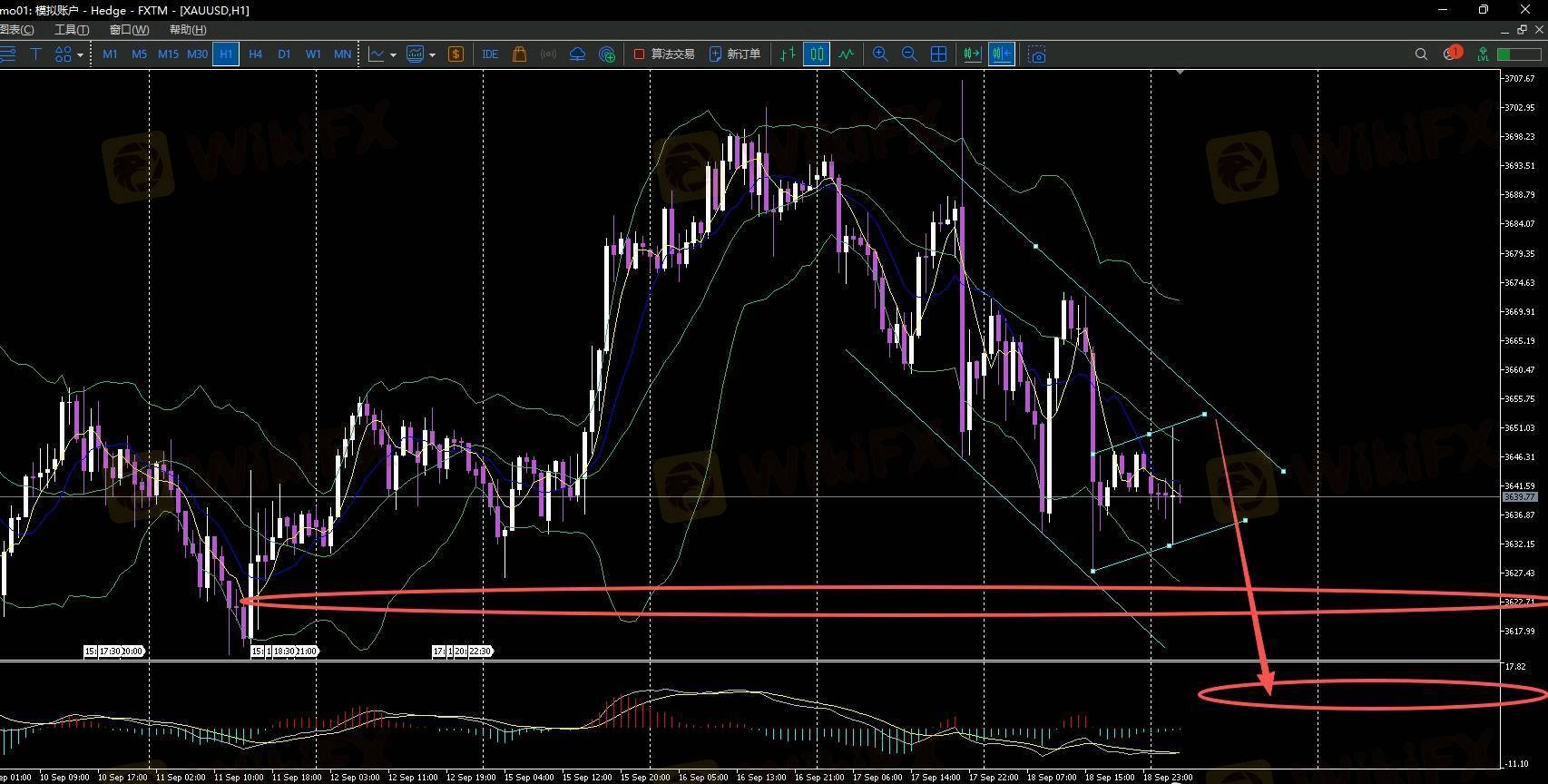 今天黄金盘面出现通道下压,通道高点在3650-3656区间,3656也是上周的三顶位置。同时也是大结构的左肩部分,今天只要3656不站上去,整体还是看跌,下方关注3620.3614/3600这些支撑。今早来了个上下打针洗盘。目前9月的第一次降息已经结束,9月下半旬看回调的概率非常大,今天日内波段高空为主,3650-3656区间自行看跌。