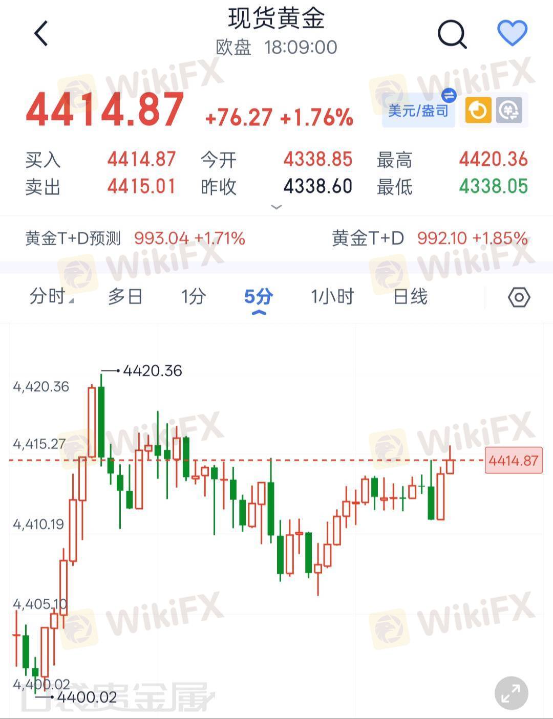 早间亚盘时段金价开盘从4338.05的低点快速拉升,最高触及4420.36,随后回落至4415-4408附近震荡,日内涨幅达1.76%,多头动能在短期释放明显; K线形态出现“急拉+高位震荡”的走势,拉升阶段阳线实体大、连续性强,震荡阶段多空博弈加剧,但价格始终站稳在日内拉升的关键支撑位4400上方,短期多头仍占据主动;当前压力位于4420,若突破则有望进一步上探4430-4440区间;