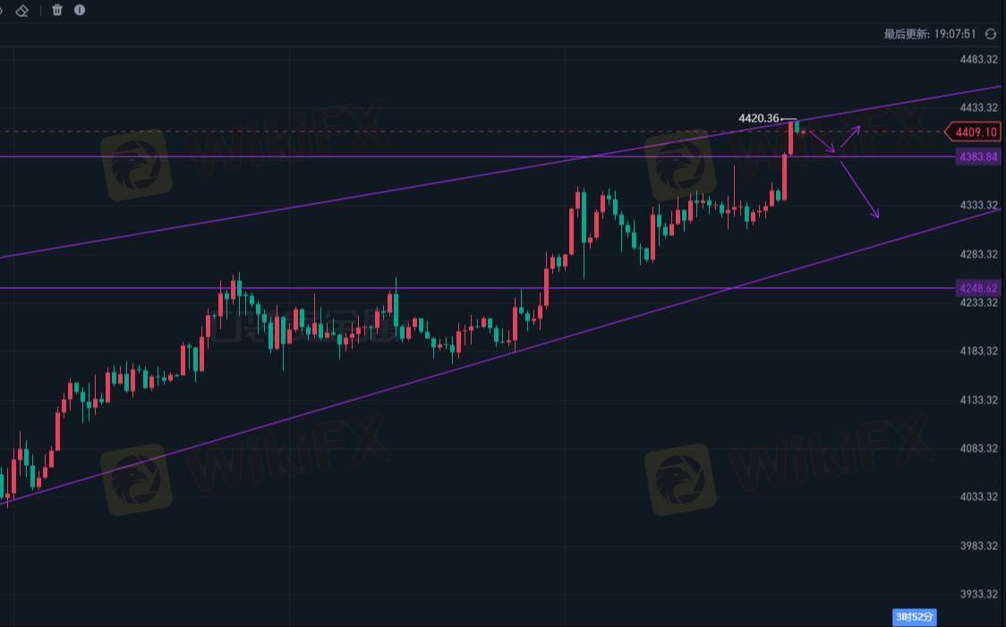 尽管当前处于回调阶段,但上升趋势的核心逻辑未变——这并非反转信号,而是多头行情中的蓄力整理。K线冲高回落的形态,实则是短期获利盘消化的过程,待回调到位后,多头反攻的动能将进一步凝聚。若金价首次触及4385-89支撑带,确认企稳后可直接布局多单;若回调幅度扩大,下探至4350-55强支撑区间,更是加仓进场的优质时机,依托通道下轨的支撑效应,后续上行空间值得期待。