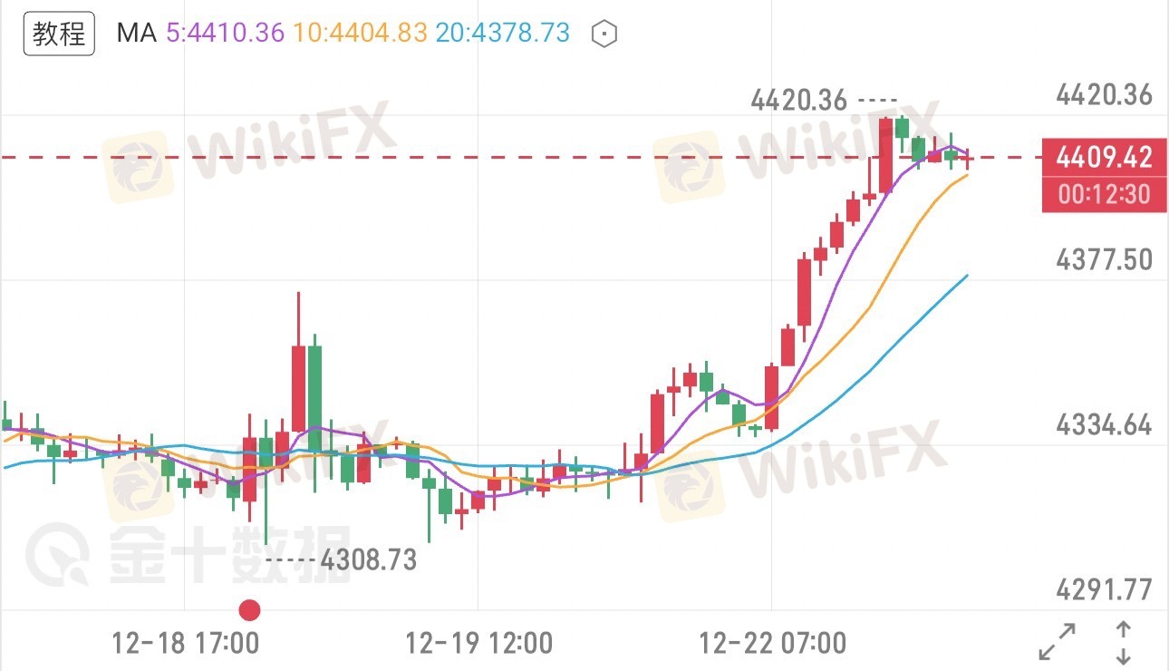 金价从早间开盘的4340位置,一路冲高至当前高点4420,单边涨幅已达80美金。接下来需重点关注晚间回撤力度,可将4420高点作为晚间看回撤的防守位,而4400则是多空分水岭。