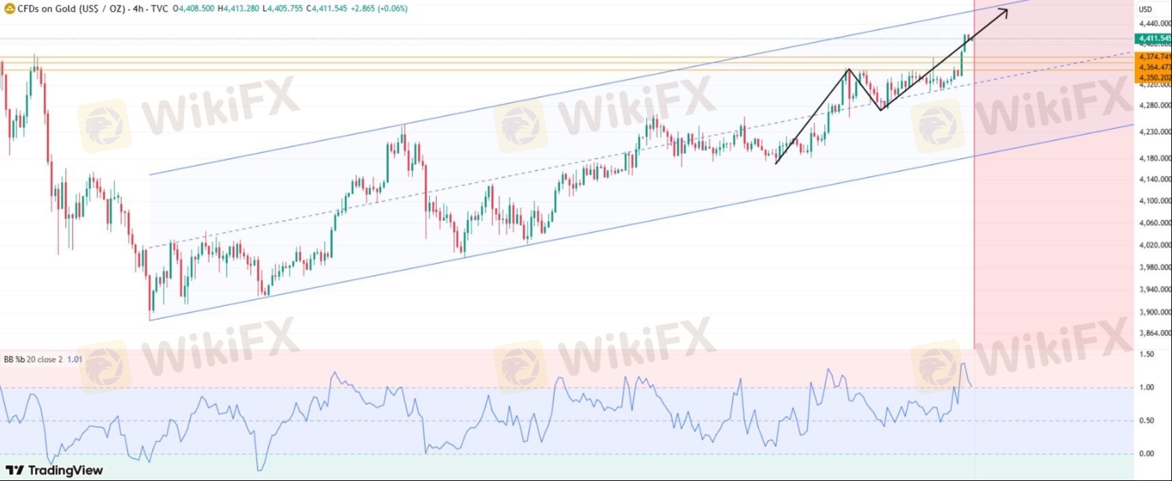 从4小时结构来看,黄金整体仍运行在上升通道内,价格沿通道下轨不断抬高,低点逐步上移,多头结构保持完整。当前价格突破并站稳前期整理区后,回踩并未破坏趋势,属于强势中的良性回调。