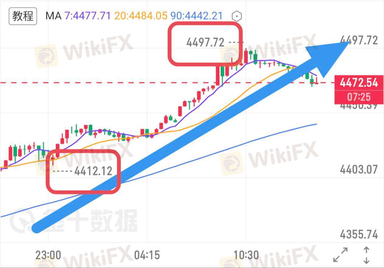 黄金昨晚给出的二次提示!依托4400关口支撑,回踩仍可依托支撑看延续;突破4420,上方空间进一步打开,行情如期而至,4400关口没有停留很久,上午已经冲高4497一线,现价4475,50美刀粒润,自由洛带!
