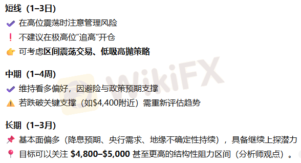 总结:黄金当前处于高位震荡格局中,长期基本面偏多,但短线受技术回落与薄市流动性影响较大。合理的操作是低吸为主、控制仓位与止损,同时关注关键支撑位是否守住。