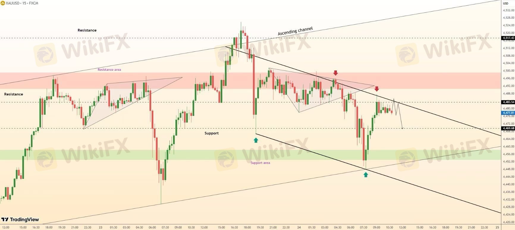 黄金在未能守住上升通道的突破行情后,目前交易于下降阻力线下方。4495 - 4505这一阻力区域多次对价格形成压制,说明看涨动能正在减弱。