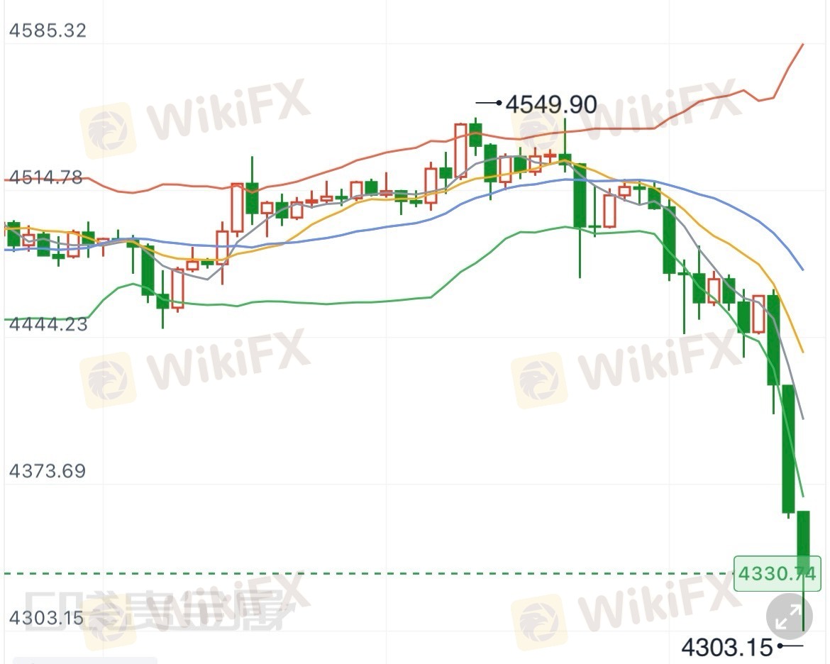 截至今日,黄金价格冲高至4550一线后,呈现瀑布式快速回落,最低下探至4300附近区间