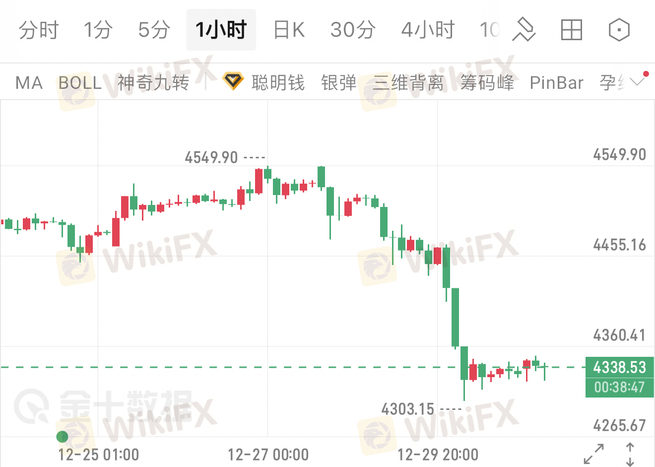近期现货黄金走势急转直下,价格从4550美元/盎司高位快速下挫,最低触及4303一线,当前回弹至4340附近整理,1小时级别K线击穿前期震荡区间,短期趋势反转令多数投资者猝不及防。