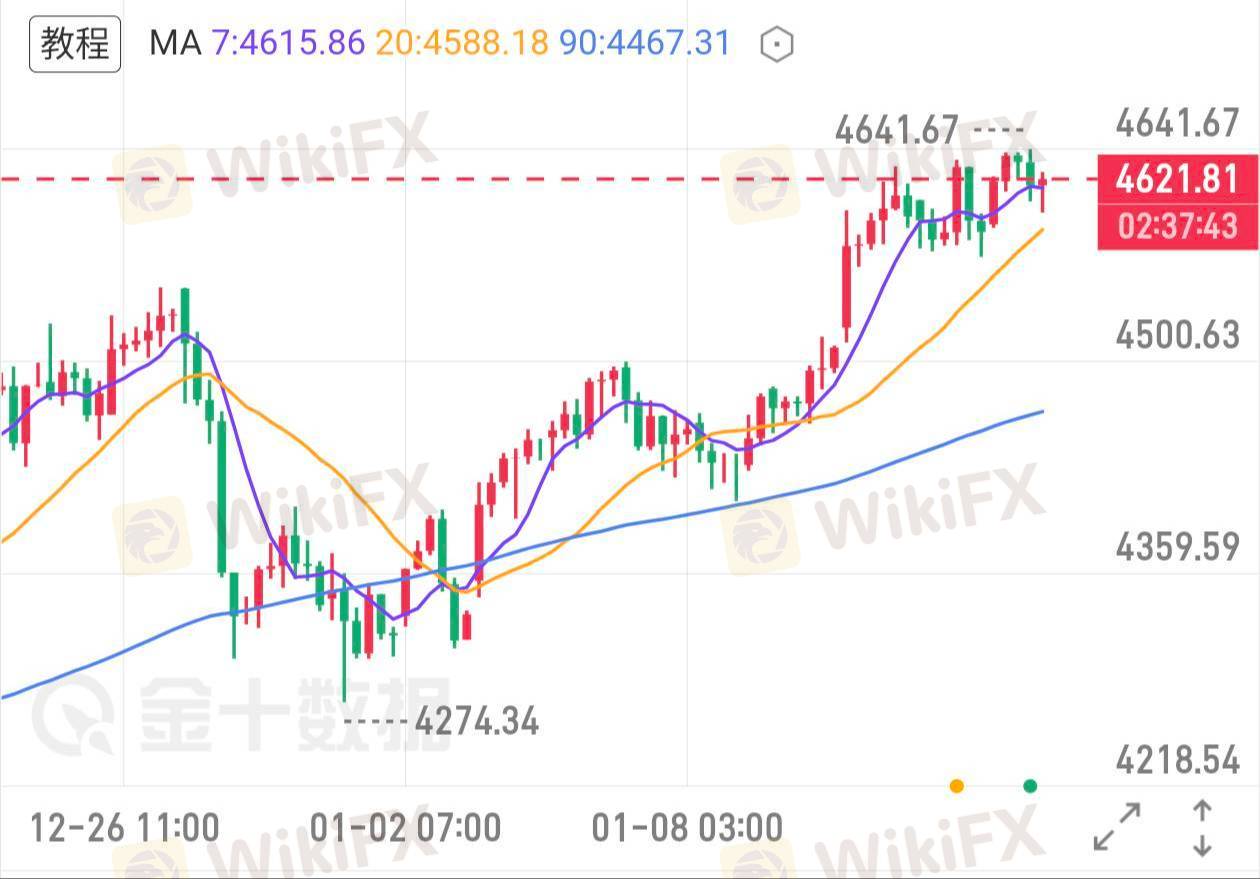 午夜时段现货黄金依旧在4600上方高位震荡,日内屡次刷新历史新高,最高触及4641.77,看似强势破高,实则走的是箱体震荡结构,从4630到4634再到4639的高点抬升,幅度有限且始终未脱离高位区间。
