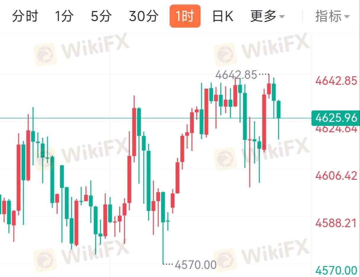 1. 压力位:1小时图中4642.85形成明显双顶阻力,是短期反弹的关键压制位,若无法突破则难再创新高;