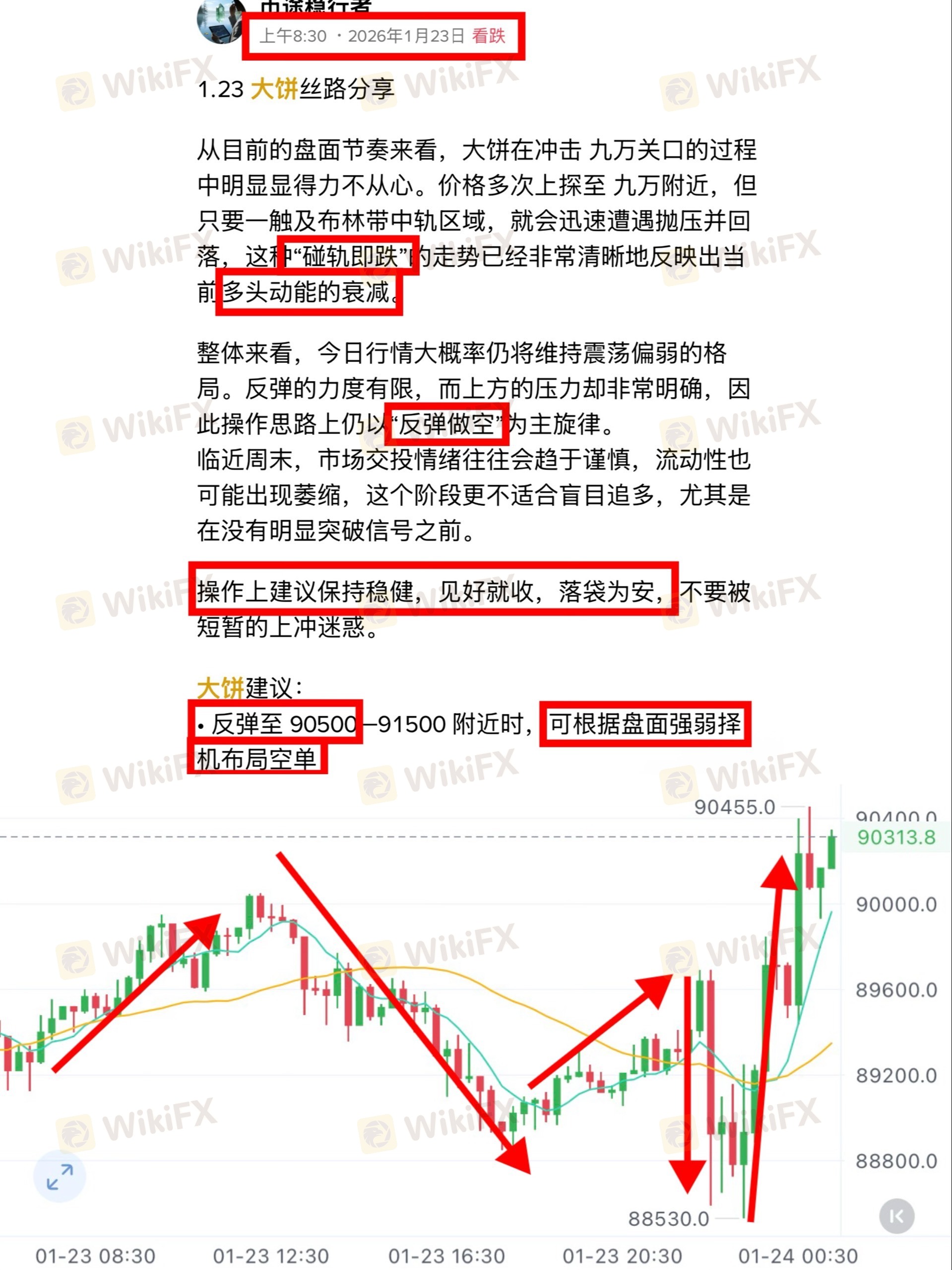 今日早间已明确提示:反弹至 90500 附近布局空单,日内多次验证该思路的有效性。