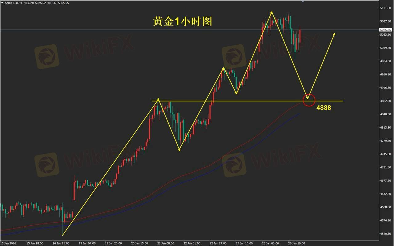 技术面上,短周期的技术点位都不大安全,极端的行情就要用极端的策略应对。今天我们直接耐心等待1小时维加斯通道的支撑位,点位在4888附近。这里也是前期高点水平支撑位,回调此处尝试布局多单。