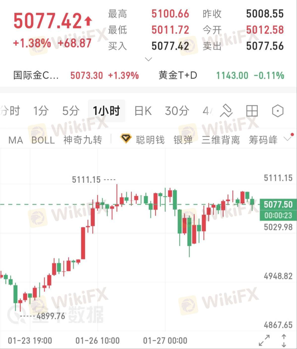 1小时K线图来看,黄金价格在经历了前期的快速拉升后,于5111一线遇阻回落,最低下探至5029.98后企稳反弹,目前回升至5077.42位置,日内涨幅达1.38%,呈现出高位震荡的走势。上涨趋势未被完全破坏,回调后快速收复失地,说明多方力量仍占据主动。