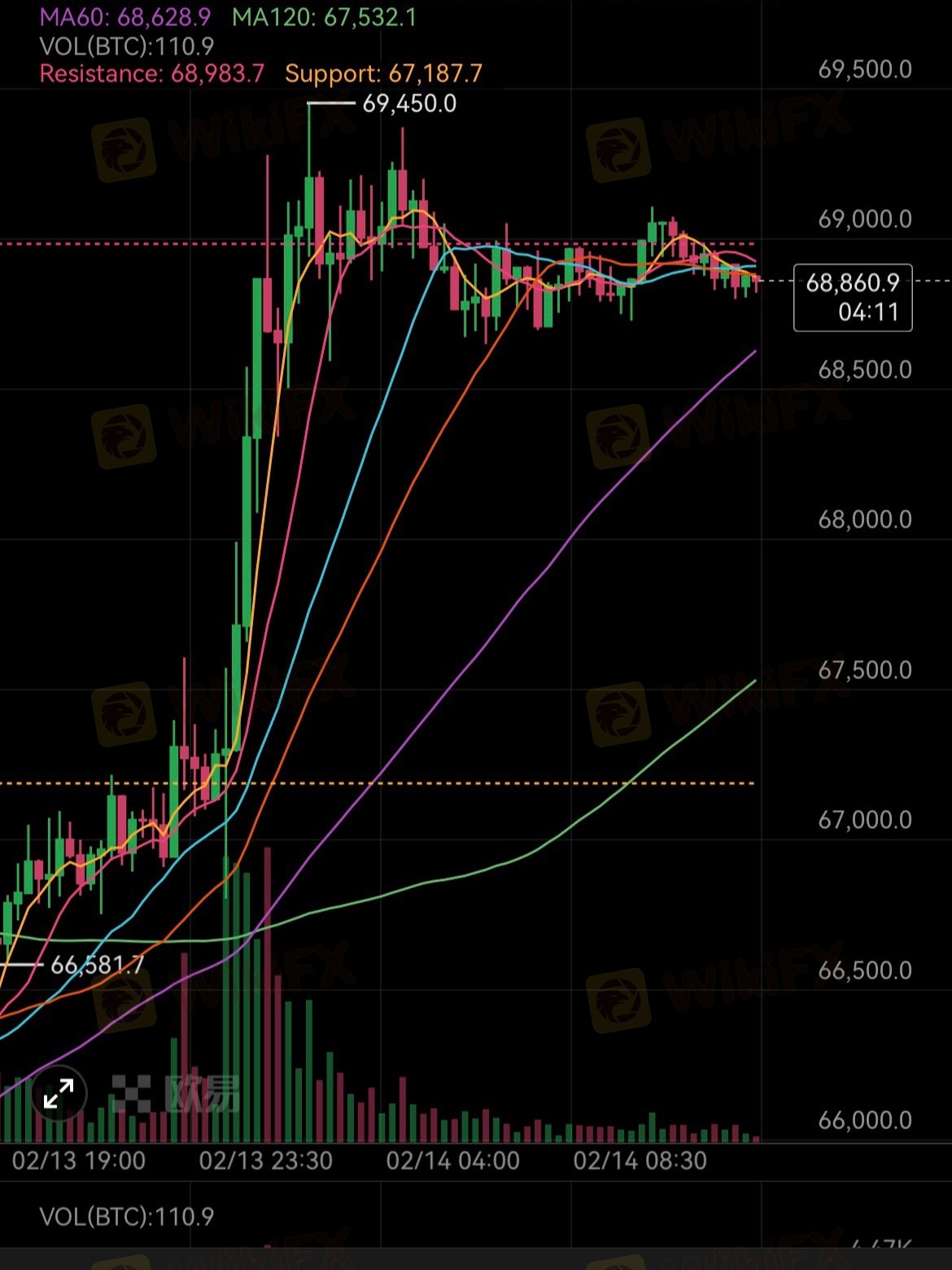 • ⚖️ 震荡:68600–69450区间,观望为主,周六难出方向,别一涨看10万、一跌看4–5万,理性看待 2/14 午间大饼公开思路
