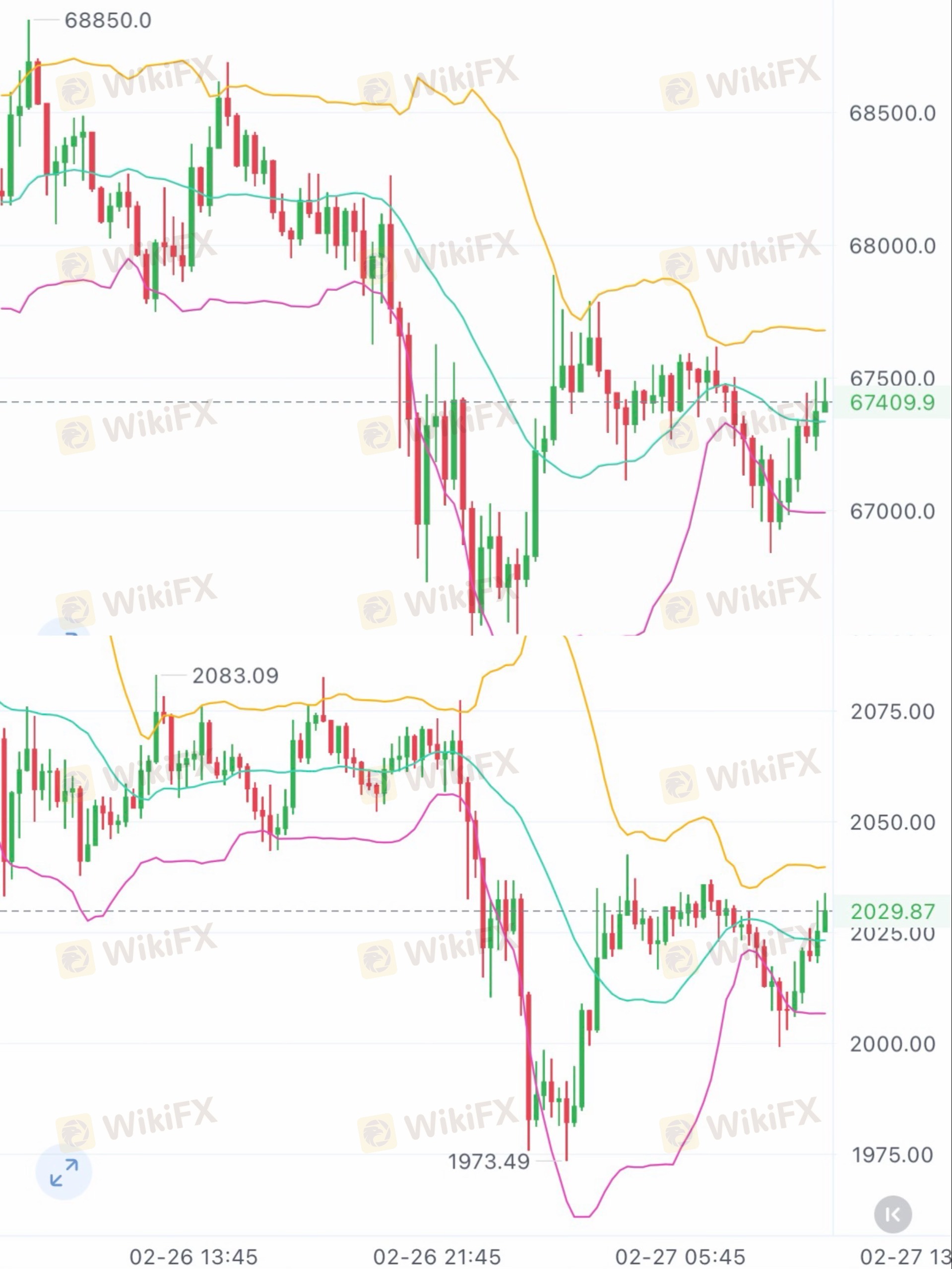 BTC:短线反弹测试中轨压力,67600为短期关键阻力,突破有望测试68000区间,跌破67000将下探66500支撑