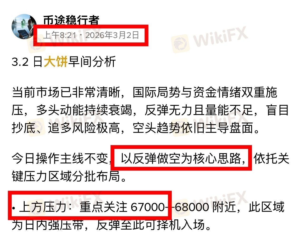 并明确给出67000 关键压力位作为做空参考区域。