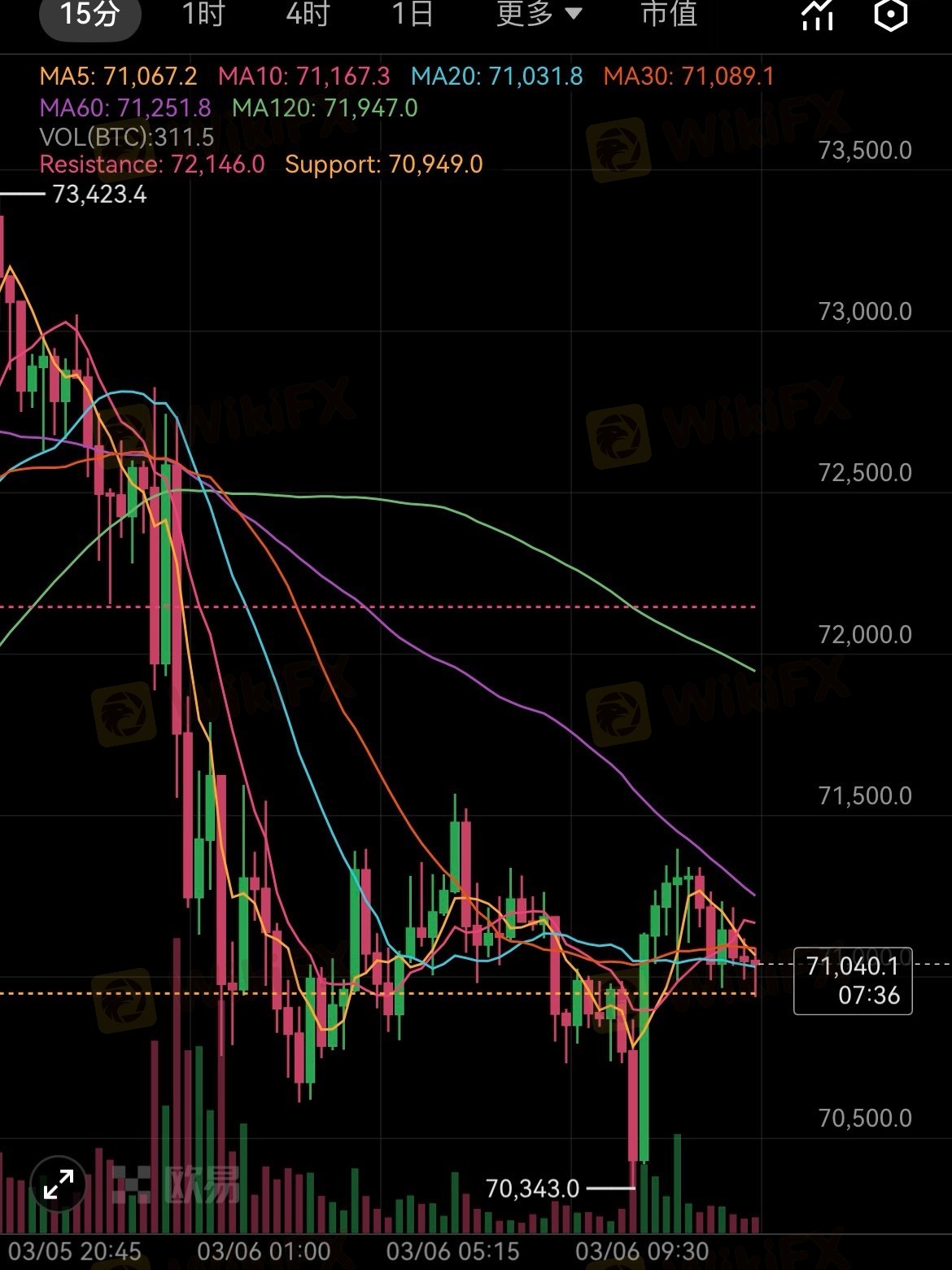 4小时:跌破70393→看69365–68189