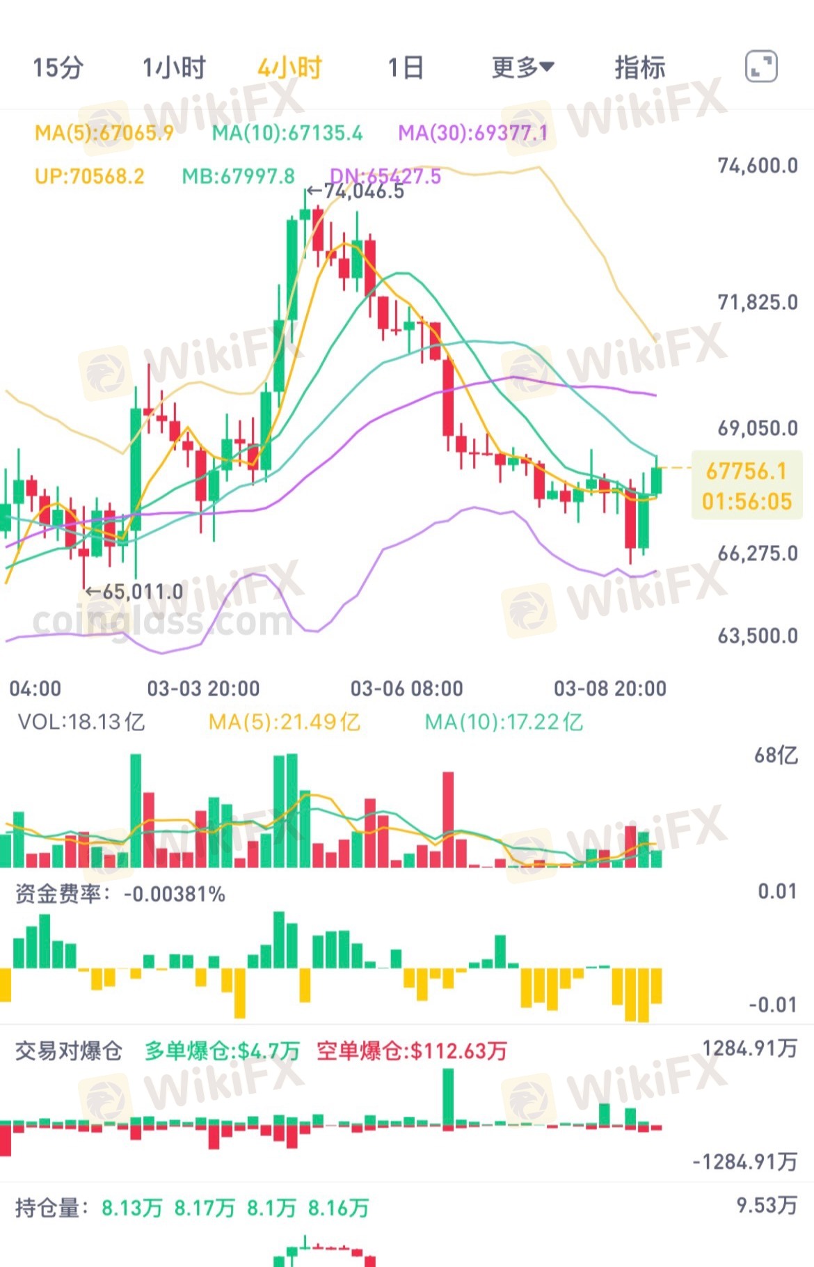 从4小时级别结构来看,BTC在 74000附近冲高回落之后,整体进入了一段明显的回调修复阶段。价格沿着 MA5、MA10均线持续震荡下行,并且多次测试 66000附近的支撑区域。结合图中布林带结构来看,当前价格已经多次触及 布林下轨 后迅速被资金拉回,说明 下方承接力度较强,市场在66000—64000区间存在明显的流动性承接与主力吸筹迹象。