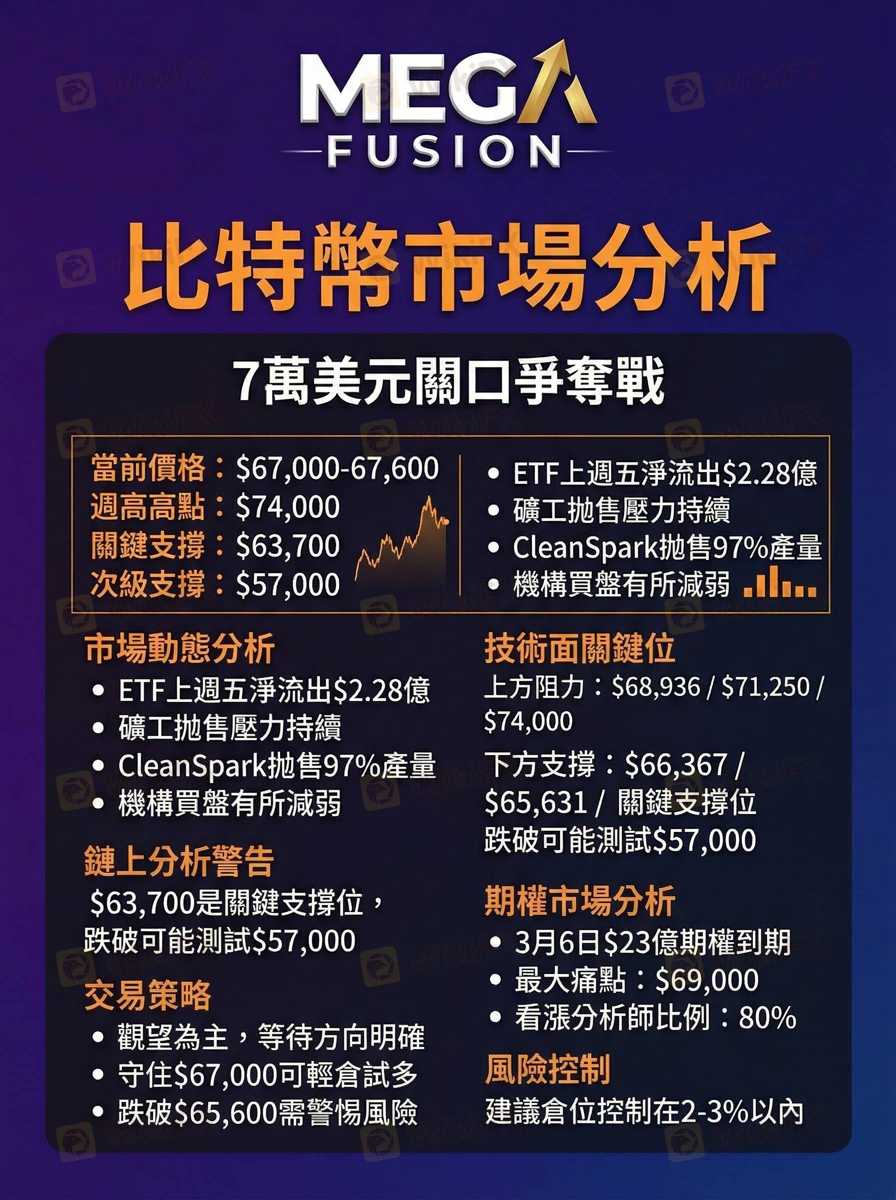 比特币现在其实进入一个很关键的位置。目前价格大概在67000美元附近。之前最高冲到74000美元。现在市场主要盯两个位置:67000支撑70000压力。最近几个变化比较明显:ETF资金出现净流出矿工卖压增加机构买盘有所减弱如果跌破65000附近行情可能会继续往下测试。所以短线来看很多交易员选择观望。